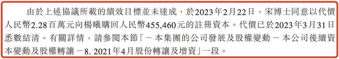 最引人关注的是,2021年初引入的股东杨曦,因绩效目标未达成,宋宁于2023年2月以228万元的代价向其回购了2.28%的股权。这一细节,直接反映出德适生物在业绩对赌方面的压力。