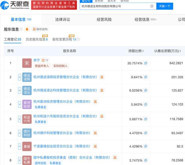 据招股书披露,德适生物2016年9月由该公司创始人、董事长、执行董事兼总经理宋宁创立。天眼查App信息显示,该公司的注册资本为8088万元,法定代表人为宋宁,主要股东包括宋宁、杭州德适诺辉投资管理合伙企业(有限合伙)等。