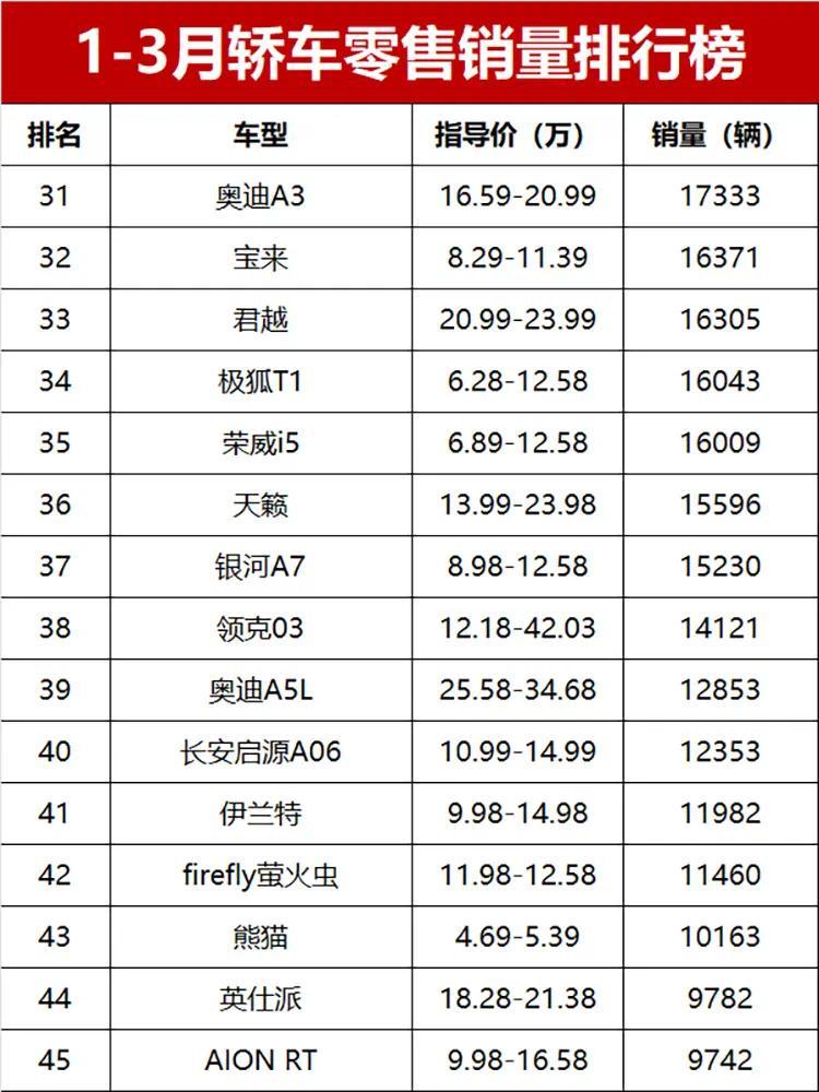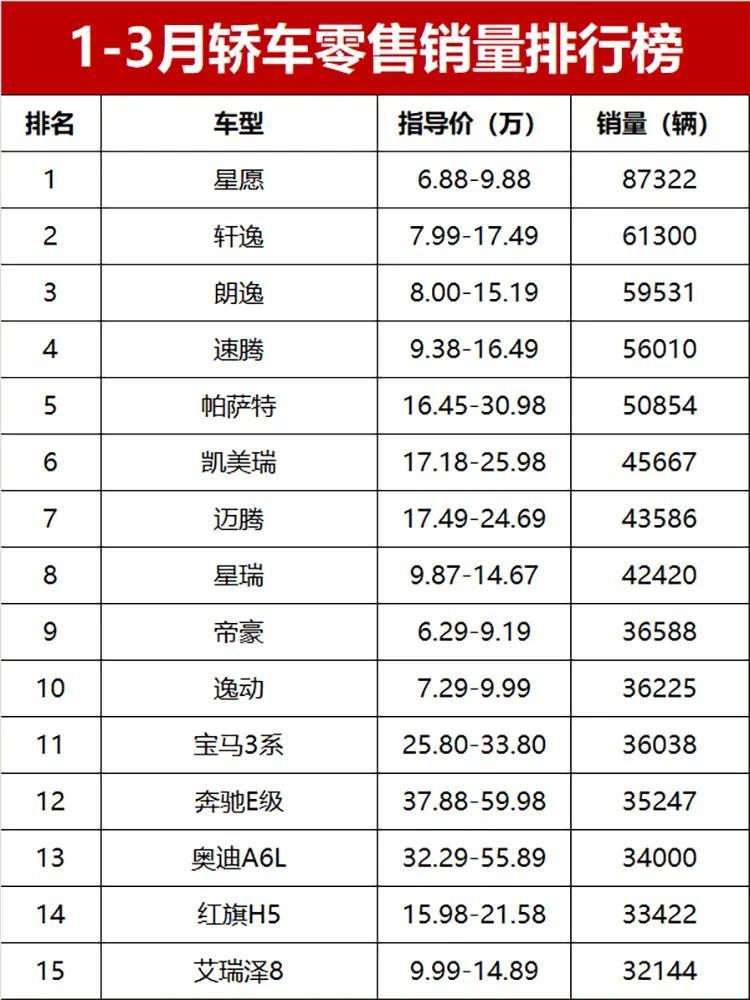 具体唠唠,一季度卖破万辆的轿车有43款,其中累计销量超过3万辆、月均销量稳稳破万的车型有14款,新能源车和燃油车各有各的亮点,没出现谁把谁按在地上摩擦的情况。冠军被星愿直接拿捏,87322辆的销量,比第二名多了两万多辆,简直是一季度轿车市场的“独一份狠活”;日产轩逸和大众朗逸跟在后面,销量分别是61300辆和59531辆,排第二、第三,不愧是合资燃油车的“老大哥”,依旧能打。