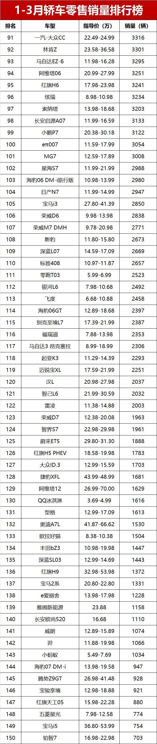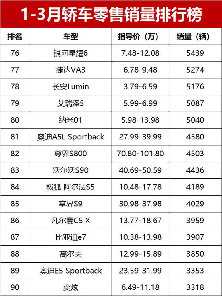 豪华品牌这边,德系三强还是老样子,霸占着头把交椅。宝马3系、奔驰E级、奥迪A6L一季度销量分别是36038辆、35247辆、34000辆,排第11到13位,妥妥的豪华轿车“铁三角”;宝马5系也不甘示弱,27963辆的销量排第22位,依旧能打。国产豪华里,红旗H5表现太亮眼了,33422辆的销量排第14位,比不少合资豪华车卖得都好,堪称国产豪华轿车的天花板,尤其是其销量高于奥迪A6L,可见国产豪华势头有多强劲。