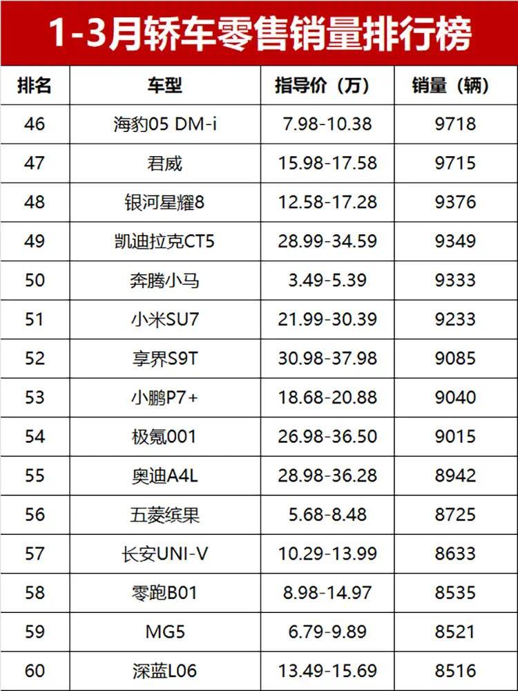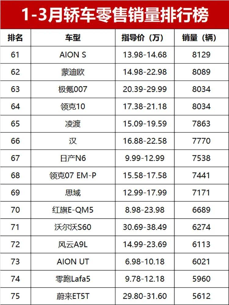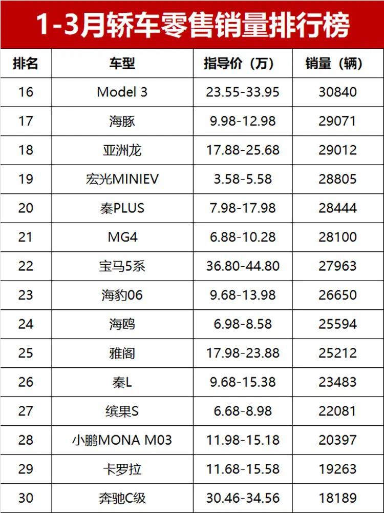 值得一提的是,10万以内的代步车,依旧有市场!除了冠军星愿,MG4、缤果S、极狐T1这些车,销量都破了2万辆,宏光MINIEV、熊猫、奔腾小马这些低价代步车,也都成功上榜,成了不少人上下班代步的首选。还有刚上市没多久的小鹏MONA M03,表现太惊喜了,20397辆的销量排第28位,妥妥的一季度“黑马”车型。